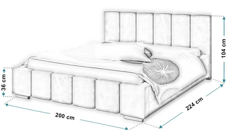- Wymiary łóżka: długość: 224 cm, szerokość: 200 cm, wysokość zagłowia: 104 cm, wysokość materacy: 17 -19 cm.