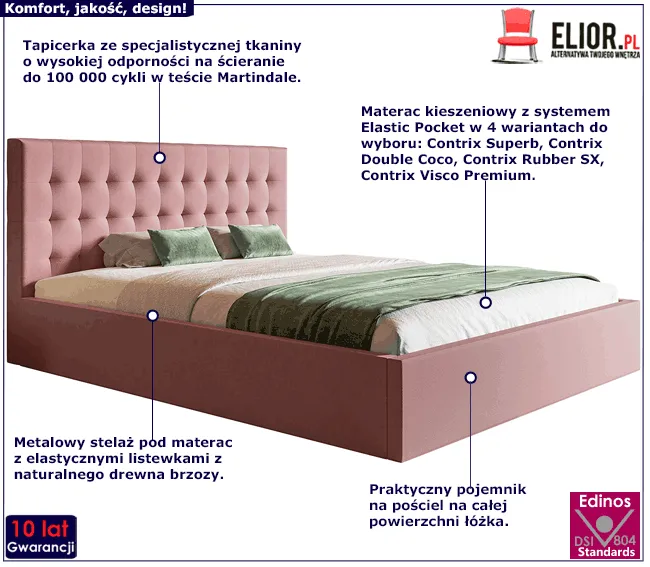 Podwójne pikowane łóżko Grade 3X to najnowsza propozycja utalentowanych designerów marki Edinos Premium. Podstawę łóżka Grade 3X tworzy solidna skrzynia o grubości 1,6 mm, wykonana z drewna naturalnego i płyty meblowej zbudowanej z włókien drzewnych i związków organicznych. Dodatkowo, płyta została uszlachetniona cienkimi filmami melaminowymi w celu zwiększenia jej trwałości. Na skrzyni obłożonej profesjonalną pianką o grubości T25 i tapicerowanej szlachetną tkaniną welwetową opiera się doskonały jakościowo metalowy stelaż o maksymalnym obciążeniu aż do 200 kg, otwierany za pomocą nowoczesnych podnośników gazowych. Stelaż wykonany z 36 sprężynujących listewek z naturalnego drewna brzozowego ułatwia cyrkulację powietrza pod materacem, co pozytywnie wpływa na jakość snu oraz wydłuża żywotność materaca. Dla podniesienia walorów użytkowych łóżko Grade 3X zostało wyposażone w praktyczny schowek na pościel, wykonany z mocnej tkaniny technicznej, przymocowanej do ramy za pomocą rzepów. Tak zaprojektowane łóżko Grade 3X zapewnia ponadczasową jakość, absolutny komfort i rewelacyjny design na lata bezpiecznego użytkowania.
