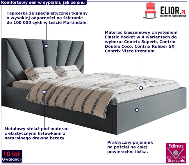 Podwójne tapicerowane łóżko Vista 3X to wyjątkowa propozycja designerów marki Edinos Premium dedykowana miłośnikom trwałych i solidnych mebli, wyróżniających się nadzwyczajną jakością i niesztampowym designem. Podstawę łóżka Vista 3X stanowi mocna skrzynia o grubości 1,6 mm, wykonana z drewna naturalnego i płyty meblowej zbudowanej z włókien drzewnych i związków organicznych. Dodatkowo, płyta została uszlachetniona cienkimi filmami melaminowymi w celu zwiększenia jej trwałości. Na skrzyni obłożonej profesjonalną pianką o grubości T25 i tapicerowanej szlachetną tkaniną welwetową opiera się doskonały jakościowo metalowy stelaż o maksymalnym obciążeniu aż do 200 kg, otwierany za pomocą nowoczesnych podnośników gazowych. Stelaż wykonany z 36 sprężynujących listewek z naturalnego drewna brzozowego ułatwia cyrkulację powietrza pod materacem, co pozytywnie wpływa na jakość snu oraz wydłuża żywotność materaca. Dodatkowym atutem łóżka Vista 3X jest praktyczny schowek na pościel, wykonany z mocnej tkaniny technicznej, przymocowanej do ramy za pomocą rzepów. Tak zaprojektowane łóżko Vista 3X marki Edinos Premium to przykład doskonałego mebla sypialnianego, który genialnie urządzi Twoją sypialnię i odkryje przed Tobą świat idealnego komfortu.