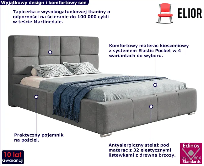 - Ergonomiczna konstrukcja - brak wystającej drewnianej, czy metalowej ramy powoduje, że nie ma ostrych kantów, o które można się uderzyć, jest miękko i bezpiecznie. Tak skonstruowane łóżko nie skrzypi, dzięki czemu nie będziesz się wybudzać przy każdej zmianie pozycji ciała.