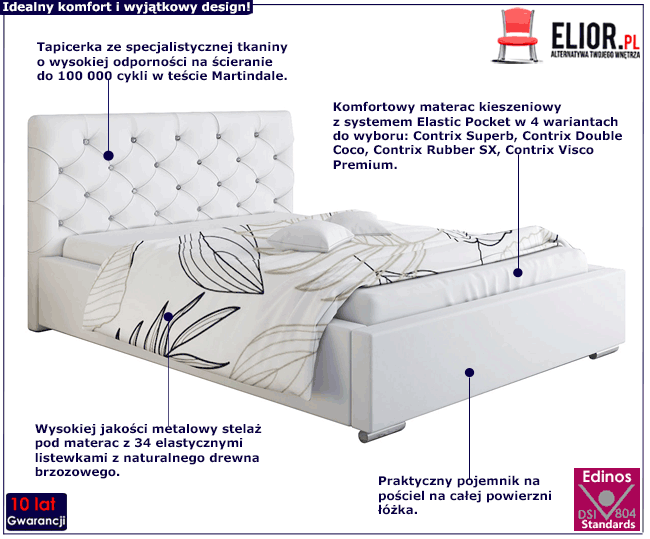 Odpowiednio dobrany do naszych potrzeb materac to podstawowy warunek zdrowego snu i komfortowego wypoczynku. Ponieważ dobór materaca zależy od wielu czynników, takich jak stan zdrowia, wiek i waga, marka Edinos Premium zaprojektowała aż cztery komfortowe materace, dedykowane do tapicerowanego łóżka Eylan 3X. Wszystkie 4 modele zostały wyposażone w system kieszeni Elastic Pocket ze strefami o zróżnicowanej twardości zapewniającymi ergonomiczną pozycję ciała. Każda sprężyna jest w osobnej otulinie z wyjątkowo elastycznego materiału, który zapobiega przecieraniu się i pękaniu kieszonek, eliminując przy tym efekt wyginania się kieszeni i dodatkowo zwiększając wytrzymałość. Sprężyny zostały wykonane w najnowocześniejszej technologii CONTROLHARD, wykorzystującej podwójne hartowanie drutu węglowego, które zapewnia ponad 50% wydłużoną żywotność. Dodatkowo każdy materac został wyposażony w pikowany pokrowiec antyalergiczny o wydłużonym cyklu ścieralności z wszytym zamkiem, który dzięki możliwości zdjęcia i wyprania pozwala zachować świeżość i najwyższy poziom higieny.