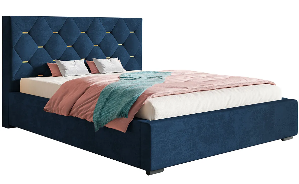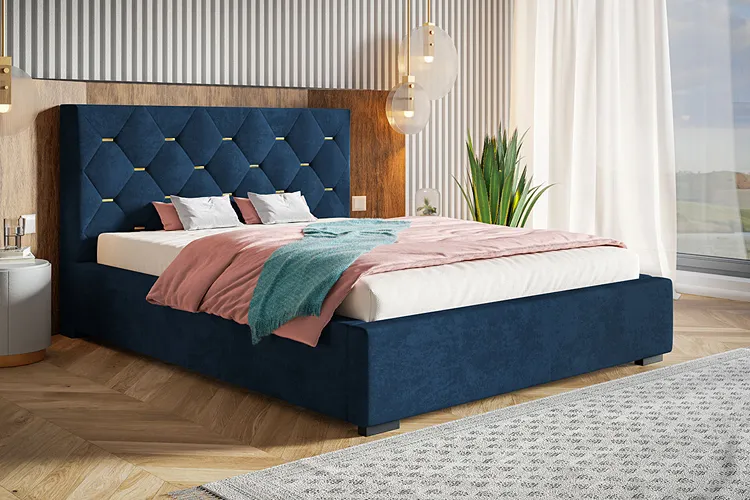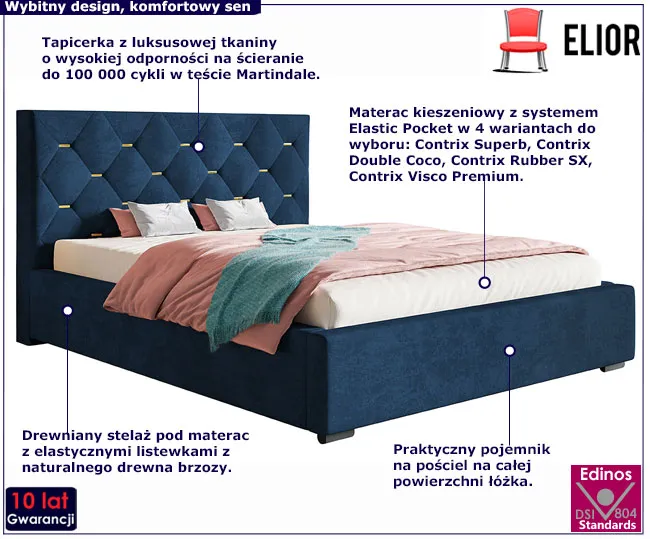 Tapicerowane łóżko Illugi 2X marki Edinos Premium to mebel dedykowany miłośnikom luksusu i amatorom ponadczasowych wnętrz spod znaku glamour. Illugi 2X stanowi mistrzowską kompozycję funkcji użytkowych z niesztampowym designem. Podstawę łóżka Illugi 2X stanowi skrzynia o grubości 1,6 mm, wykonana z naturalnego drewna i płyty meblowej zbudowanej z włókien drzewnych, związków organicznych oraz dodatkowo uszlachetnionej cienkimi filmami melaminowymi w celu zwiększenia trwałości. Na skrzyni obłożonej profesjonalną pianką o grubości T25 i tapicerowanej szlachetną tkaniną welwetową opiera się doskonały jakościowo drewniany stelaż z 32 sprężynujących listewek z naturalnego drewna brzozowego. Tak skonstruowany stelaż ułatwia cyrkulację powietrza pod materacem, co doskonale wpływa na jakość snu oraz wydłuża żywotność materaca. Dla podniesienia komfortu i funkcjonalności łóżko Illugi 2X zostało wyposażone w praktyczny pojemnik na pościel niezwykle łatwo otwierany przy pomocy profesjonalnych podnośników sprężynowych. Tak zaprojektowane łóżko Illugi 2X marki Edinos Premium to idealna propozycja dla osób spragnionych komfortowego wypoczynku i zdrowego snu w luksusowym otoczeniu.