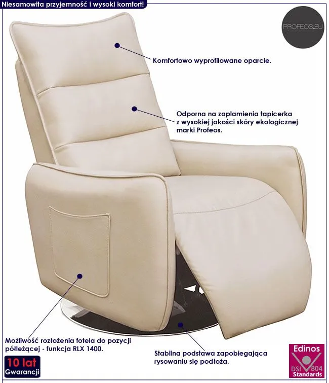Fotel wyposażony jest w unikalny mechanizm RLX 1400. Funkcja RLX 1400 umożliwia Ci odchylenie oparcia aż do pozycji półleżącej, idealnej na popołudniową drzemkę. Dzięki czterem wersjom kolorystycznym bez problemu wybierzesz ten mebel, który najlepiej wkomponuje się w Twoje wnętrze. Fotel Profeos doskonale sprawdza się nie tylko w salonie czy sypialni, pozwala Ci na komfortowy relaks także podczas przerwy w pracy w biurze czy pracowni. Daj się uwieść niesamowitemu designowi fotela rozkładanego Kseniok, zakochasz się w nim od pierwszego wejrzenia!