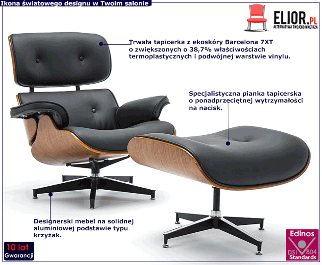 Fotel z podnóżkiem Tanga 2X marki Edinos Premium to współczesna interpretacja designerskiego fotela klubowego, zaprojektowanego przez Hermana Millera w 1956 roku, na 50. urodziny Billego Widera. Słynny reżyser “Bulwaru Zachodzącego Słońca” podobno uwielbiał relaks w tym niezwykłym fotelu, który kształtem przypominał sfatygowaną rękawicę bejsbolową. Ponadczasowy design i niezwykła wygoda mebla spowodowała, że stał się kwiatową ikoną i obiektem pożądania kolejnych pokoleń miłośników designu. Dlatego właśnie projektanci marki Edinos Premium postanowili podarować swoim klientom fantastyczną alternatywę dla kultowego fotela i stworzyli genialny fotel Tanga 2X. Tanga 2X wyróżnia się precyzyjnie zaprojektowaną formą, która daje niezwykle komfortowe oparcie dla kręgosłupa. Podstawę fotela tworzą trzy elementy – siedzisko, oparcie i zagłówek. Całość łączy aluminiowa konstrukcja z podstawą typu krzyżak. Nisko umieszczone siedzisko oraz wygodny podnóżek zostały pokryte grubą warstwą specjalistycznej pianki oraz ekskluzywną pikowaną tapicerką z ekoskóry. Elegancka linia fotela oraz piękna kolorystyka w odcieniu orzechowego drewna i głębokiej czerni tworzą ponadczasowy mebel, idealnie dopasowany do wnętrz w stylu klasycznym, minimalistycznym, loftowym i oczywiście retro.