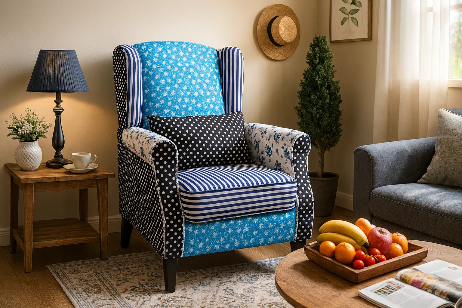 - Modny wzór: patchwork w niebieski deseń. Kliknij w link i sprawdź także inne fotele patchworkowe w sklepie Edinos.pl. Stwórz swój praktyczny zestaw mebli.