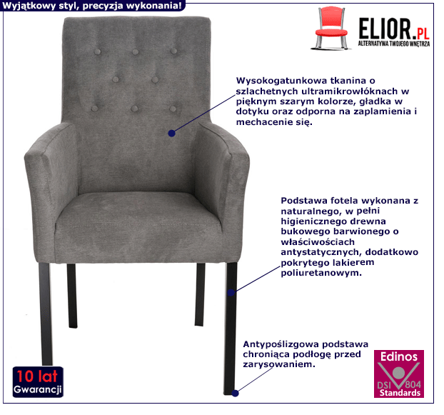 Pikowany fotel Inix to okazała, szlachetna propozycja – pełna ponadczasowego szyku, staranna i trwała, o komfortowej formie i wysublimowanej kolorystyce. Z tak pięknie i interesująco zaprojektowanym fotelem każda przestrzeń staje się elegancka, modna i jedyna w swoim rodzaju. Wysublimowany, stylowy odcień szarości sprawi, że pomieszczenie, do którego wstawisz fotel Inix stanie się wyrafinowane, a zarazem innowacyjne i modernistyczne. Ciemna podstawa dodaje meblowi klasy i wdzięku. Świetne pikowanie na oparciu fotela prezentuje się szlachetnie i jakże modnie. Całość zachwyca harmonią w nowoczesnym wydaniu. Ale Inix to mebel ponadczasowy, ponieważ tak staranna i komfortowa forma zawsze i wszędzie jest użyteczna! Najwyższa pora na odświeżenie swojej aranżacji. Zapomnij o dawno już niemodnych, nieciekawych i topornych propozycjach meblarskich. Rewelacyjny, przepiękny fotel Inix to wspomnienie dawnych czasów, jednak w modernistycznej, unowocześnionej odsłonie. Sprawdź, jak piękny Inix sprawdza się na żywo. Na pewno zachwyci i Ciebie swoją klasą oraz niezrównanym komfortem użytkowania!