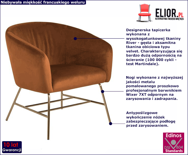W trosce o bezpieczeństwo i najwyższy poziom satysfakcji naszych klientów tworzymy produkty z wysokogatunkowych materiałów. Designerska tapicerka mebla w wykonana została z wysokogatunkowej tkaniny River - to gęsta i aksamitna tkanina obiciowa typu velvet. Materiał ten jest niesamowicie miękki i aksamitny w dotyku, a do tego lekko połyskuje dodając całości szlachetności i elegancji. River to jeden z francuskich welurów posiadający bardzo dobrą odporność na ścieranie (do 100 000 cykli - test Martindale). Konstrukcja mebla wykonana została z najwyższej jakości metalu pomalowanego proszkowo odpornym na zarysowania i zadrapania. Najwyższa jakość techniki metody natrysku proszkowego pozwoliła zaoferować firmie Elior aż 10 lat gwar. na swoje produkty. Technika malowania proszkowego charakteryzuje się dużą trwałością, odpornością na korozję, chemikalia, wysoką temperaturę oraz uszkodzenia mechaniczne, dzięki czemu znacznie podnosi walory użytkowe i estetyczne mebla. Ponadto nóżki fotela zostały dodatkowo wyposażone w antypoślizgowe wykończenia, które chronią podłogi Twojego domu przed zarysowaniami i uszkodzeniami mechanicznymi.