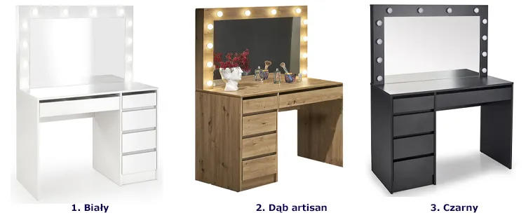 3 modne kolory: Biały, Dąb artisan, Czarny. Sprawdź naszą ofertę i wybierz swój ulubiony wariant kolorystyczny toaletki Dorino.