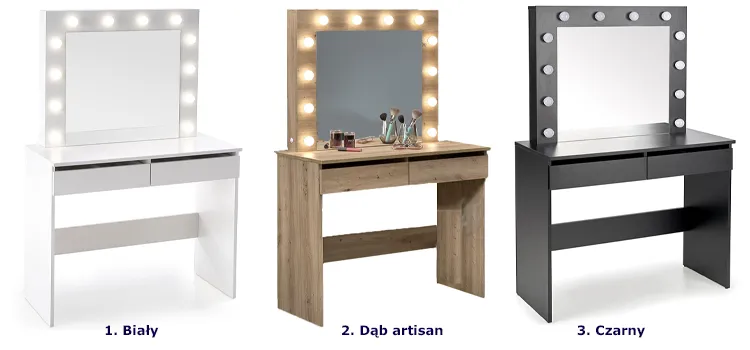 3 modne kolory: Biały, Dąb artisan, Czarny. Sprawdź naszą ofertę i wybierz swój ulubiony wariant kolorystyczny toaletki Priam.