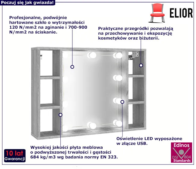 • oświetlenie LED wokół lustra ze złączem USB zapewnia idealne warunki do makijażu oraz jest bardzo łatwe w użyciu