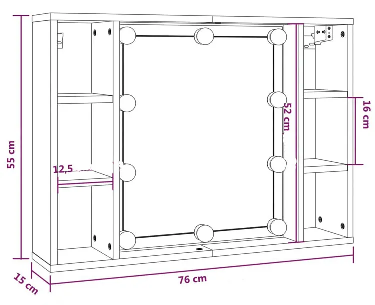 • Wymiary całkowite: szerokość: 76 cm, głębokość: 15 cm, wysokość: 55 cm.