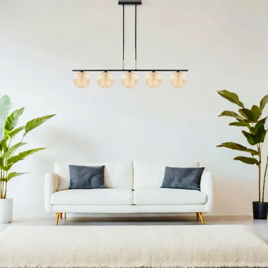 Jeśli chcesz stworzyć klimat, który będzie jednocześnie nowoczesny, ciepły i pełen stylu, to właśnie znalazłeś odpowiednie oświetlenie. Pięć szklanych kloszy o kulistym kształcie zapewniają równomierne i przytulne rozproszenie światła. Prosta, geometryczna konstrukcja w układzie liniowym idealnie sprawdza się nad stołem jadalnianym lub wyspą kuchenną. J002-Sama marki Lumes to propozycja dla tych, którzy lubią, gdy funkcjonalność spotyka się z designem na najwyższym poziomie. A może właśnie od niej zacznie się metamorfoza Twojej jadalni albo salonu?
