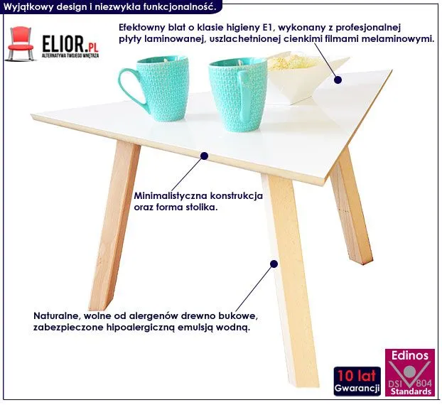 Z przyjemnością przedstawiamy Ci zachwycający stolik kawowy Bovi marki Elior. Produkty Elior charakteryzują się wyrazistym designem i dbałością o każdy detal mebla, a wdzięk i nowoczesność, jak również mocna i stabilna konstrukcja, to cechy naszej najnowszej ławy. Jej niesamowity styl oczaruje Cię od pierwszego wejrzenia. Komfortowy stolik kawowy z blatem w kształcie trójkątnym Bovi, to najnowsze przedsięwzięcie młodych europejskich projektantów. Wyróżnia się nie tylko swoją praktyczną formą i niebanalnym kształtem, ale także zastosowaniem materiałów najlepszej jakości. To dlatego cieszy się powodzeniem wśród osób lubiących nowatorskie rozwiązania. Designerski blat, wykonany został z profesjonalnej płyty laminowanej, uszlachetnionej cienkimi filmami melaminowymi. Posiada także specjalne włókna ułożone różnokierunkowo o strukturze sinusoidalnej, co zapewnia nadanie jej cech jakościowych oraz wytrzymałościowych. Niezwykła, minimalistyczna konstrukcja mebla, wyprodukowana została z naturalnego drewna bukowego, co gwarantuje jej trwałość i niepodatność na uszkodzenia. Ława Bovi dodaje wnętrzu harmonii i elegancji, a każda wypita przy niej kawa smakuje doskonale!