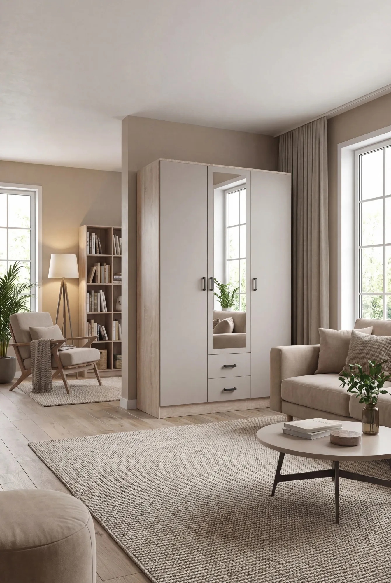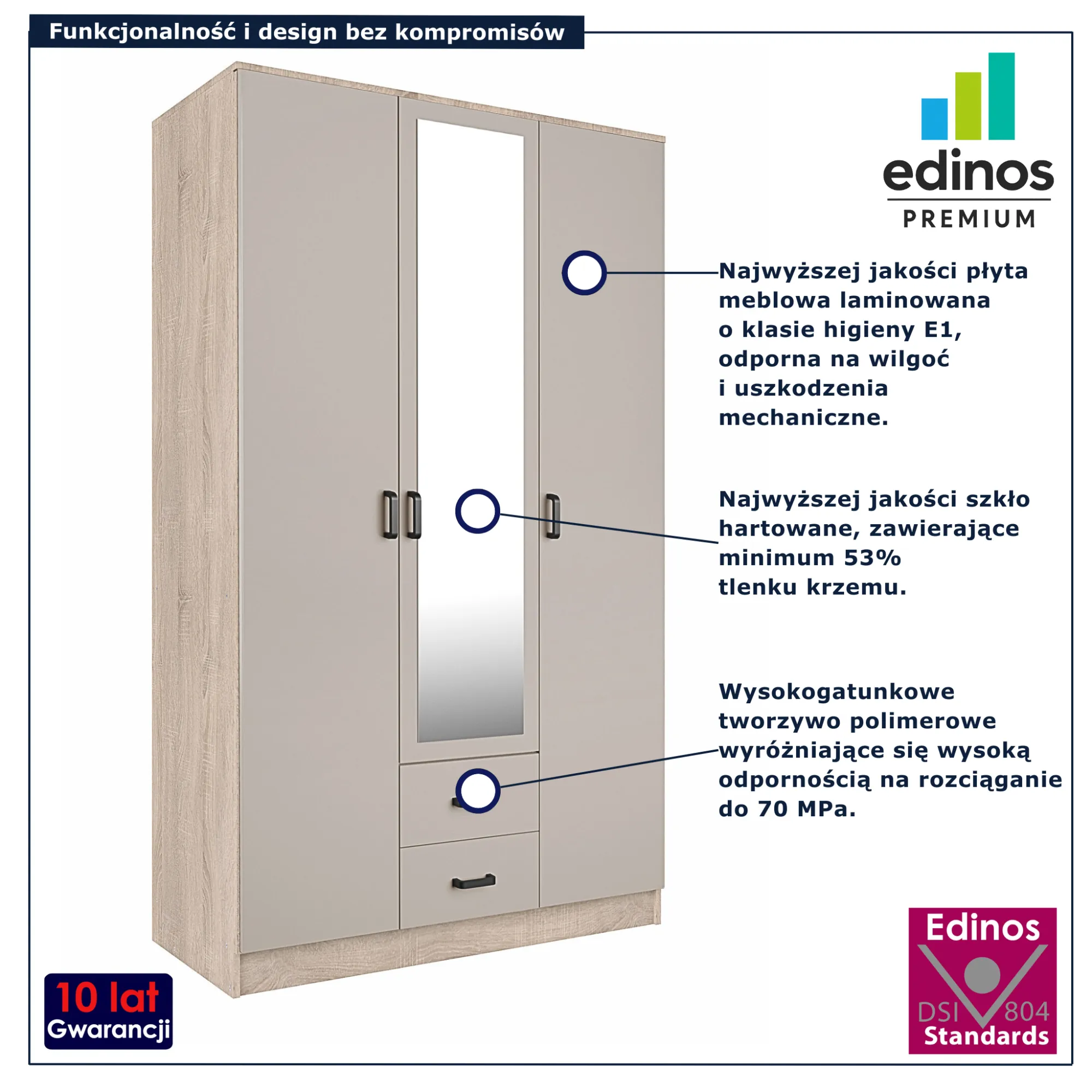 Szafa Montixa marki Edinos Premium to propozycja dla osób, które potrzebują naprawdę dobrze zaplanowanej przestrzeni do przechowywania, bez kompromisów w wyglądzie i wygodzie. Jej szeroka, stabilna bryła sprawia, że idealnie sprawdzi się w sypialni, garderobie lub przestronnym przedpokoju, oferując dużo miejsca na ubrania i dodatki. Centralnie umieszczone lustro wprowadza do wnętrza lekkość, rozjaśnia je i optycznie powiększa, a przy tym staje się praktycznym elementem codziennego użytkowania. Wnętrze szafy zostało zaprojektowane tak, aby maksymalnie ułatwić organizację - drążek na ubrania, pojemne półki oraz dwie dolne szuflady pozwalają utrzymać porządek i szybko odnaleźć wszystko, czego potrzebujesz. Montixa to szafa, która porządkuje przestrzeń i daje poczucie kontroli nad codziennym chaosem.