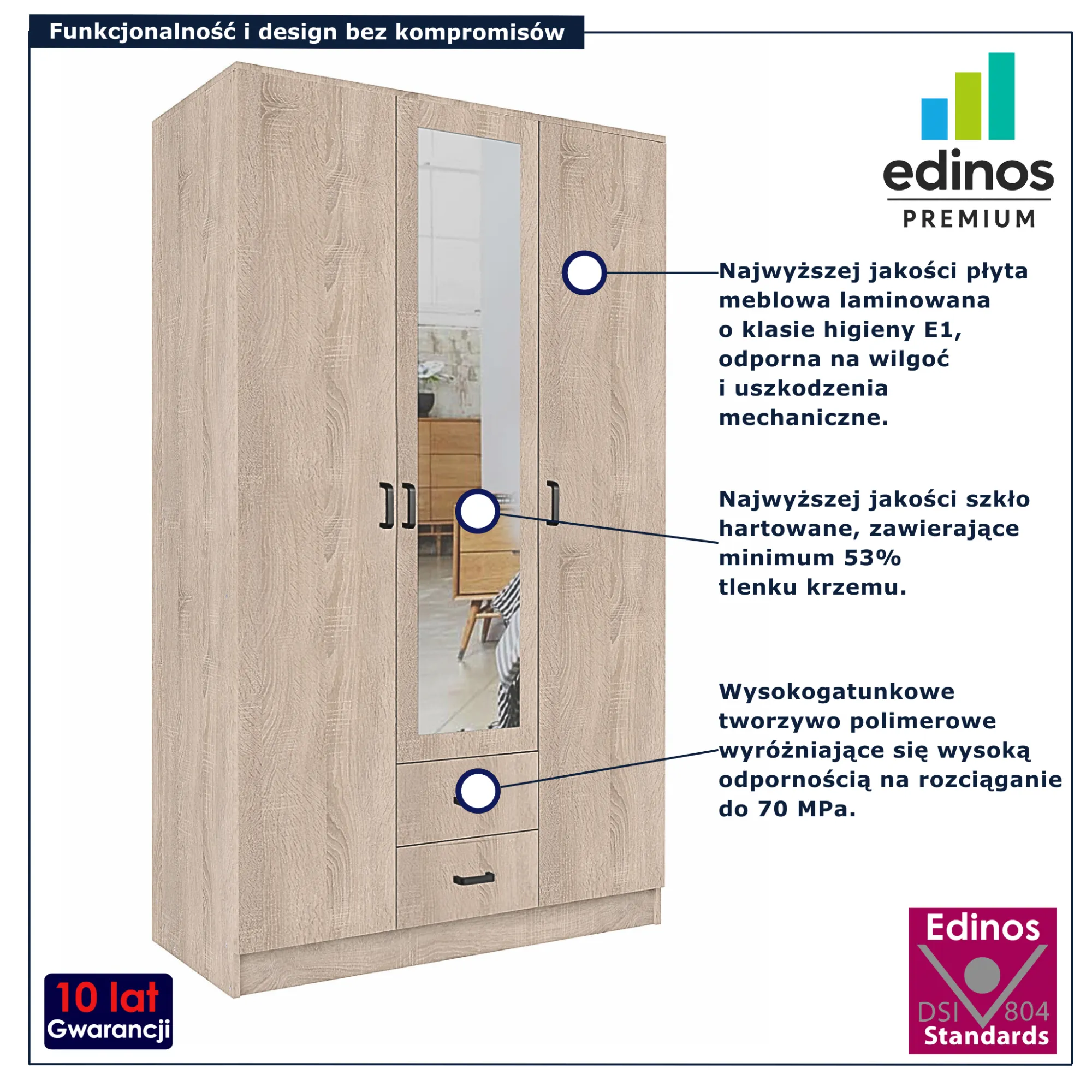 • Produkt posiada certyfikat jakości "Edinos Standards DSI 804", który potwierdza najwyższą jakość wykonania mebla oraz pełny stopień zgodności poszczególnych jednostek wytworzonego wyrobu z przyjętym wzorcem.