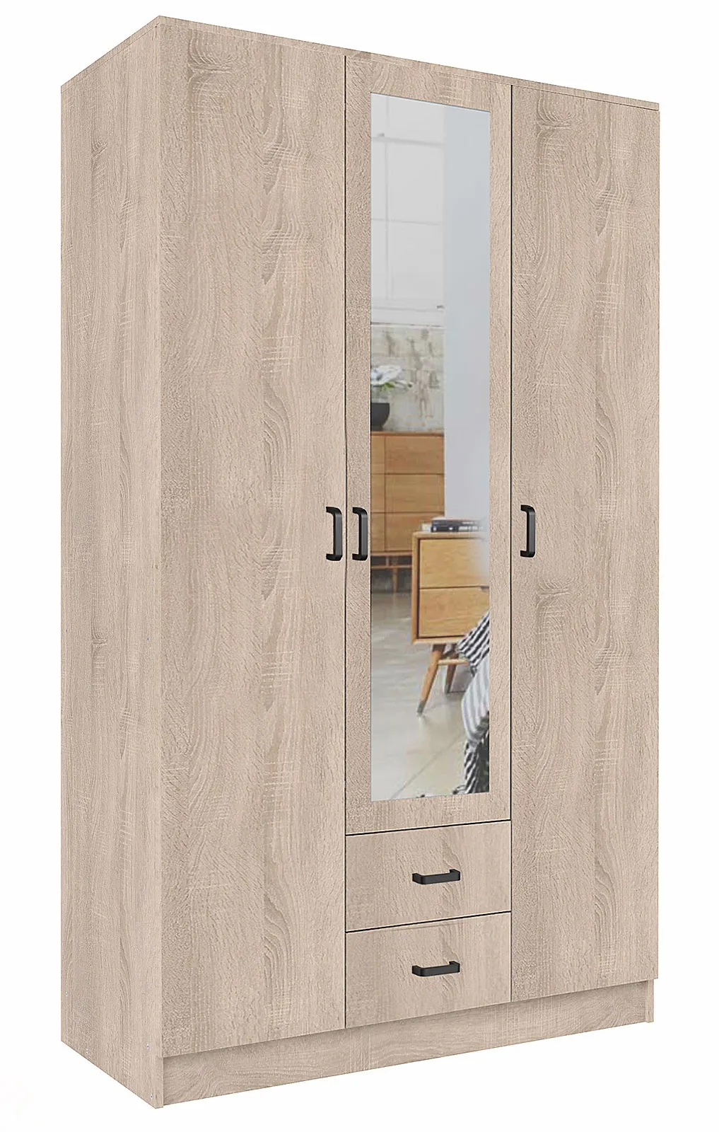 Trzydrzwiowa szafa z lustrem i szufladami dąb sonoma - Montixa