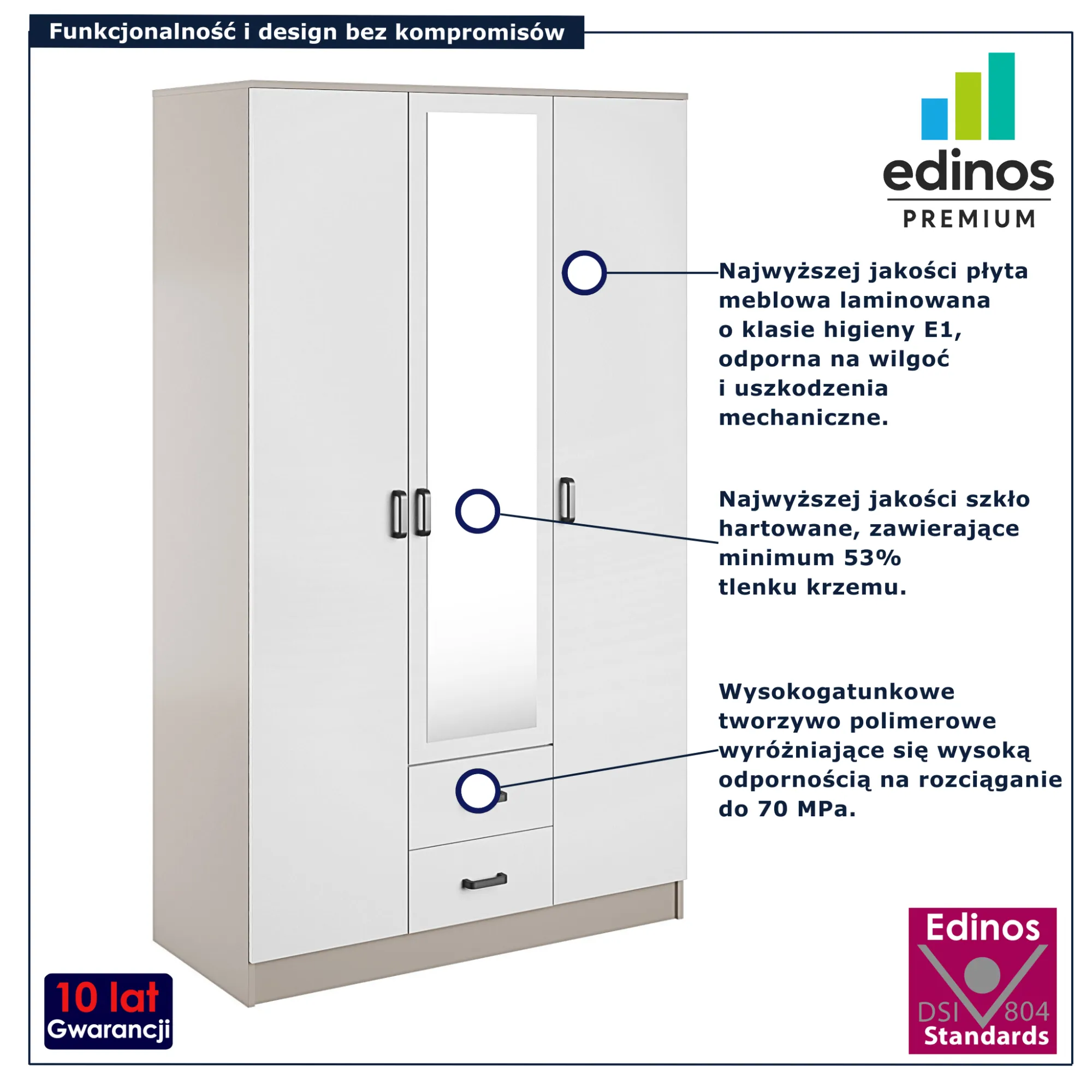 Szafa Montixa marki Edinos Premium to propozycja dla osób, które potrzebują naprawdę dobrze zaplanowanej przestrzeni do przechowywania, bez kompromisów w wyglądzie i wygodzie. Jej szeroka, stabilna bryła sprawia, że idealnie sprawdzi się w sypialni, garderobie lub przestronnym przedpokoju, oferując dużo miejsca na ubrania i dodatki. Centralnie umieszczone lustro wprowadza do wnętrza lekkość, rozjaśnia je i optycznie powiększa, a przy tym staje się praktycznym elementem codziennego użytkowania. Wnętrze szafy zostało zaprojektowane tak, aby maksymalnie ułatwić organizację - drążek na ubrania, pojemne półki oraz dwie dolne szuflady pozwalają utrzymać porządek i szybko odnaleźć wszystko, czego potrzebujesz. Montixa to szafa, która porządkuje przestrzeń i daje poczucie kontroli nad codziennym chaosem.