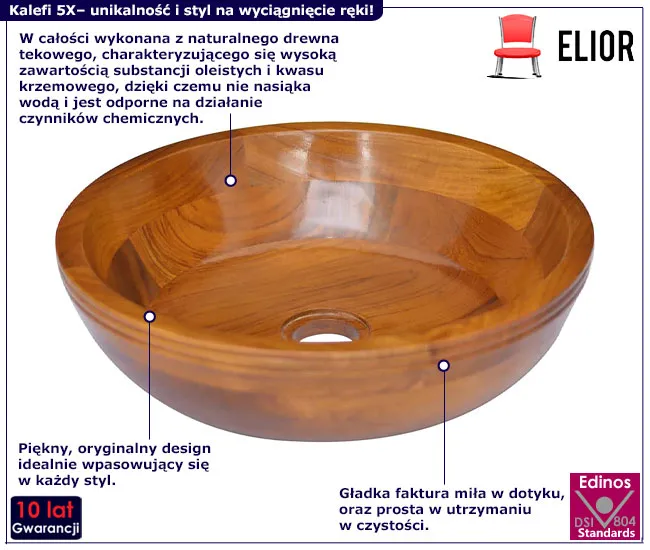 • Każda umywalka jest unikatowa, dzięki naturalnym wzorom drewna tekowego, co sprawia, że jest to wyjątkowy dodatek do wnętrza.
