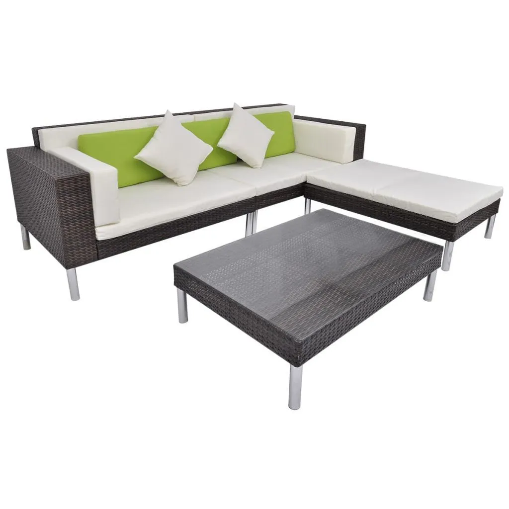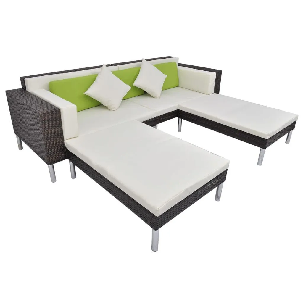 Polirattanowy zestaw mebli ogrodowych łączy w sobie styl i funkcjonalność. Stanie się on głównym punktem w Twoim ogrodzie lub na tarasie. Zestaw zaprojektowano tak, by można było z niego korzystać przez cały rok na zewnątrz. Dzięki wykorzystaniu odpornego na czynniki pogodowe rattanu PE meble da się w łatwy sposób wyczyścić, są bardzo trwałe i odpowiednie do codziennego użytkowania. Zestaw zbudowano na solidnej, trwałej, stalowej ramie. Meble są również lekkie i modułowe, dzięki czemu można je łatwo przestawiać i dopasować do każdego otoczenia. Grube, zdejmowane poduszki można zdjąć i wyprać. W skład przesyłki wchodzą: 2 sofy narożnikowa, 1 puf, 1 stolik, 4 poduszki na siedziska, 2 poduszki na oparcia, 2 poduszki na podłokietniki, 3 zielone poduszki oraz 2 małe poduszki kremowe. Uwaga: zalecamy przykrycie zestawu na czas opadów deszczu, śniegu i mrozu.