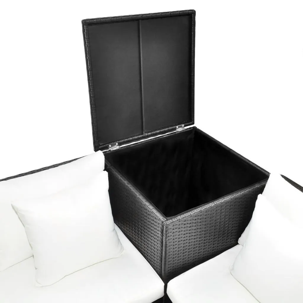 Rattanowy zestaw mebli ogrodowych łączy w sobie styl i funkcjonalność. Będzie stanowić główny punkt w Twoim ogrodzie, na tarasie lub patio. Zestaw mebli został zaprojektowany do całorocznego użytku na zewnątrz. Dzięki zastosowaniu odpornego na warunki pogodowe oraz wodę rattanu meble te są łatwe w czyszczeniu, wytrzymałe i odpowiednie do codziennego użytku, Zestaw ma mocną, krytą proszkowo ramę, która nadaje mu trwałości. Jest również lekki, co pozwala na jego swobodne przestawianie. Odporne na wodę skrzynie stanowią idealne miejsce do przechowywania koców, poduszek, zabawek, książek i innych przedmiotów. Grube, zdejmowane poduszki są bardzo wygodne oraz posiadają poszewki z poliestru z zamkiem błyskawicznym, dzięki czemu można je z łatwością zdjąć i wyprać. Rattanowe meble modułowe są bardzo ustawne i mogą być przestawiane dowolnie, aby dopasować je do otoczenia. Przesyłka zawiera 2 sofy dwuosobowe, 1 stolik kawowy ze szklanym blatem, 1 skrzynię do przechowywania z wodoodporną torbą, 2 poduszki na siedziska, 4 poduszki na oparcia i 4 poduszki dekoracyjne. Uwaga: zalecamy przykrycie zestawu na czas deszczu, śniegu i mrozu.