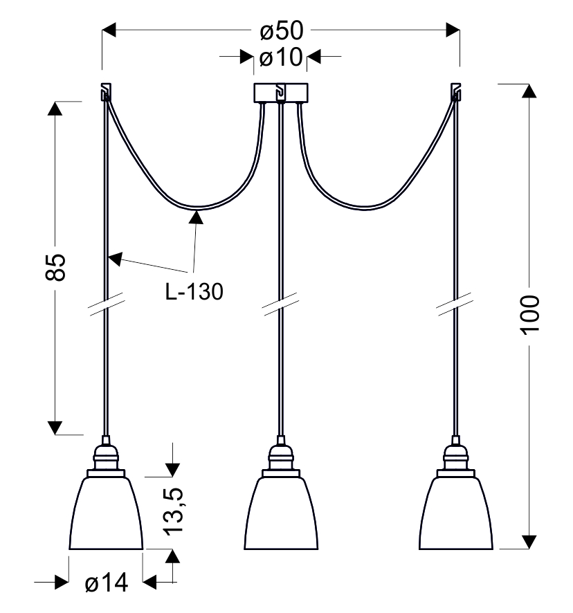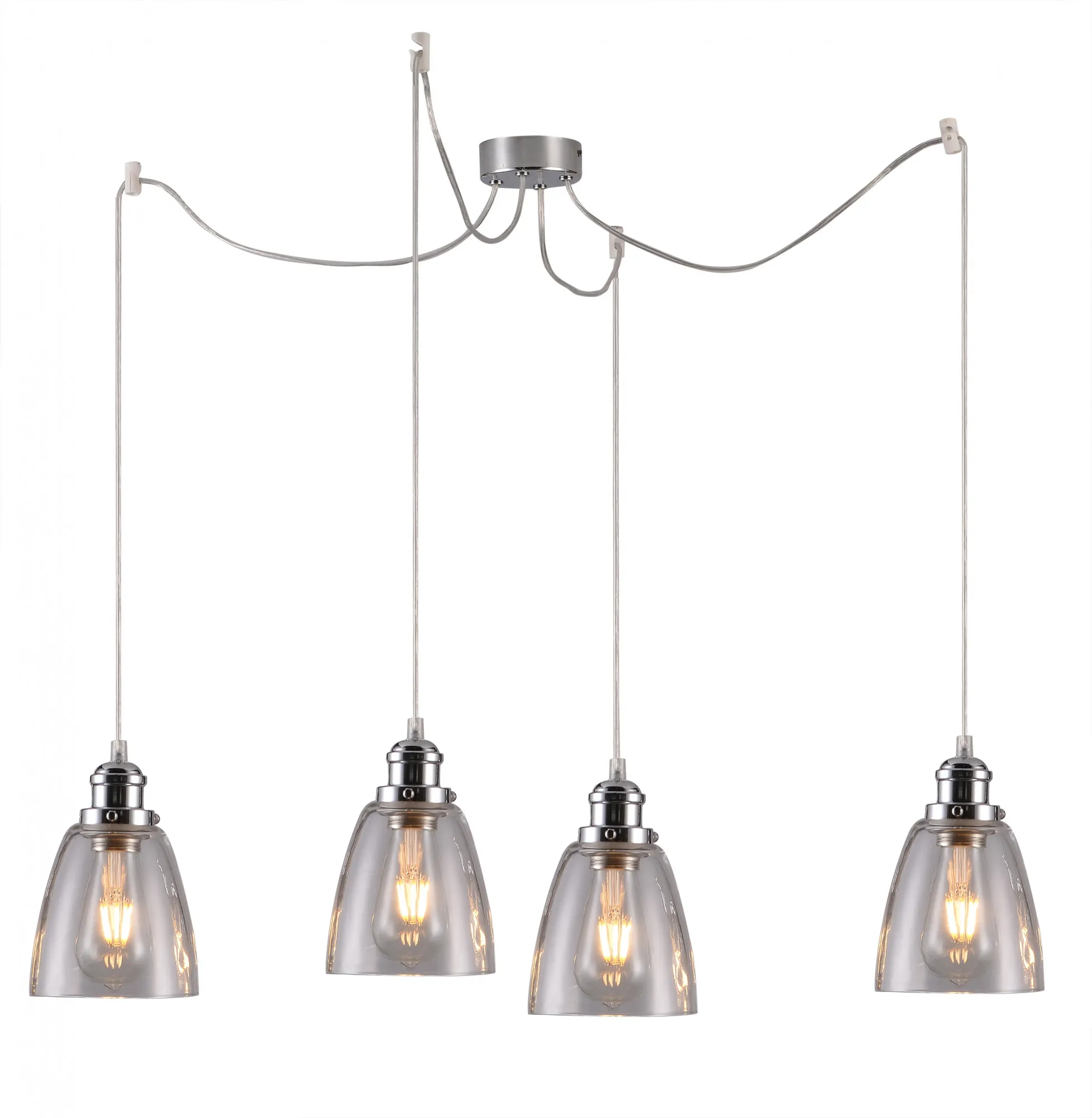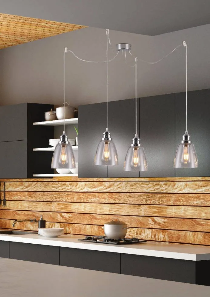 Innowacyjne rozwiązanie do nowoczesnych wnętrz, gładkie klosze z bezbarwnego szkła na długich srebrnych linkach z chromowanymi oprawkami dodają elegancji. Dowolność miejsca montażu poszczególnych linek z kloszami na niezależnych zawieszkach które umożliwiają regulację wysokości po zamontowaniu.