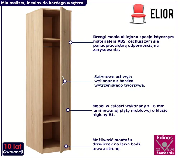 Potrzebujesz dodatkowego miejsca do przechowywania? Podsiadasz już klasyczną szafę, oraz garderobę, ale pozostała jeszcze niewielka przestrzeń, którą chciałabyś zagospodarować? Świetnie trafiłaś - szafa Dartin marki Edinos Premium, to mebel który spełni Twoje oczekiwania. Niewielkie wymiary, klasyczna forma, stonowana kolorystyka oraz niezbędne wyposażenie - drążek i dwie półki, to zalety, które widać już na pierwszy rzut oka. Wybierz szafę Dartin marki Edinos Premium i przekonaj się jak wspaniale komponuje się z Twoimi meblami w sypialni, salonie, pokoju dziecka, czy korytarzu.