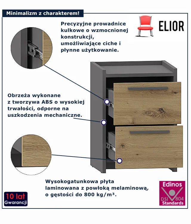 • Produkt posiada certyfikat jakości "Edinos Standards DSI 804", który potwierdza najwyższą jakość wykonania mebla oraz pełny stopień zgodności poszczególnych jednostek wytworzonego wyrobu z przyjętym wzorcem.