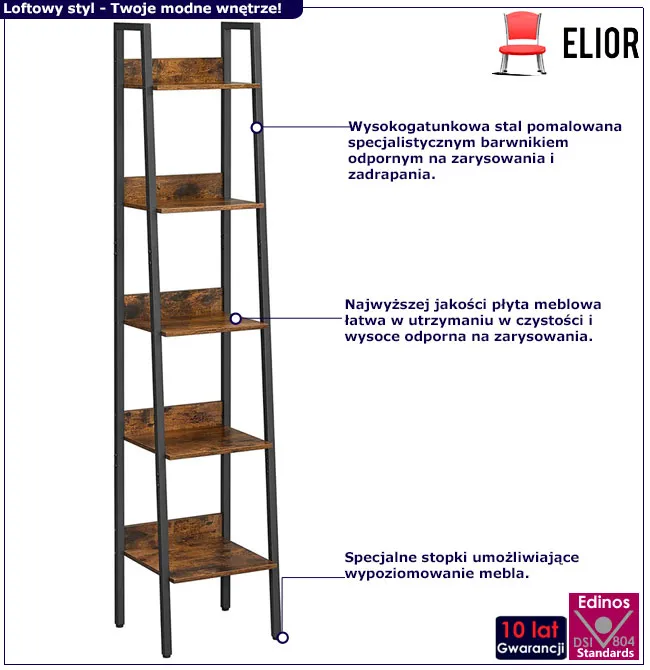 Odkryj regał Marinex marki Elior, który przekracza granice zwykłej meblowej funkcjonalności, wprowadzając do Twojego domu esencję loftowej elegancji. Wzniesiony na solidnych fundamentach wysokogatunkowej stali i dopełniony subtelnym wdziękiem rustykalnego brązu, regał loft Marinex jest dziełem sztuki użytkowej. Ten wyjątkowy regał, z jego pięcioma poziomami na życiowe skarby, został stworzony z myślą o tych, którzy pragną harmonijnie połączyć estetykę z codzienną praktycznością, tworząc przestrzeń zarówno inspirującą, jak i zapraszającą do życia pełnego stylu.