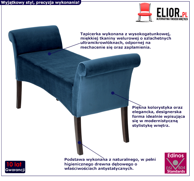 To widać już na pierwszy rzut oka, że fantastyczną ławkę Selsa zaprojektowano profesjonalnie i trwale! Piękna, efektowna ławka Selsa powstała z wysokogatunkowych surowców. Podstawa mebla to naturalne, w pełni higieniczne drewno bukowe o właściwościach antystatycznych. Tapicerka powstała z przepięknej tkaniny welurowej o szlachetnych ultramikrowłóknach, miękkiej i gładkiej w dotyku. Ta tkanina odznacza się odpornością na zabrudzenia, wycieranie oraz na mechacenie się. Zestawienie tych surowców sprawia, że ławka Selsa prezentuje się stylowo, designersko, ale i ponadczasowo. Ponadto charakteryzuje się trwałością i odpornością na uszkodzenia. To niezwykle istotne, by meble, w które inwestujemy, cechowało wytrzymałe, staranne wykonanie. Na szczęście ze znakomitym siedziskiem tapicerowanym Selsa nie trzeba się o to zupełnie martwić! Fantastyczna ławka Selsa posłuży Ci na lata nie tylko swoją wygodą i funkcjonalizmem, ale przede wszystkim wyjątkową, zachwycającą stylistyką!