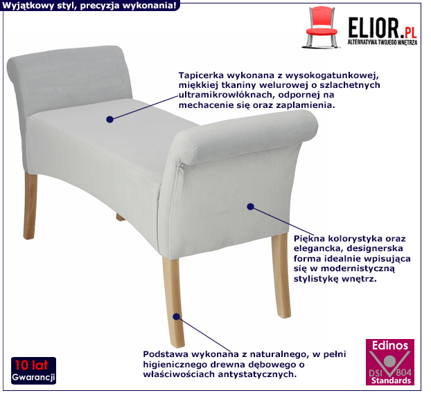 To widać już na pierwszy rzut oka, że fantastyczną ławkę Selsa zaprojektowano profesjonalnie i trwale! Piękna, efektowna ławka Selsa powstała z wysokogatunkowych surowców. Podstawa mebla to naturalne, w pełni higieniczne drewno bukowe o właściwościach antystatycznych. Tapicerka powstała z przepięknej tkaniny welurowej o szlachetnych ultramikrowłóknach, miękkiej i gładkiej w dotyku. Ta tkanina odznacza się odpornością na zabrudzenia, wycieranie oraz na mechacenie się. Zestawienie tych surowców sprawia, że ławka Selsa prezentuje się stylowo, designersko, ale i ponadczasowo. Ponadto charakteryzuje się trwałością i odpornością na uszkodzenia. To niezwykle istotne, by meble, w które inwestujemy, cechowało wytrzymałe, staranne wykonanie. Na szczęście ze znakomitym siedziskiem tapicerowanym Selsa nie trzeba się o to zupełnie martwić! Fantastyczna ławka Selsa posłuży Ci na lata nie tylko swoją wygodą i funkcjonalizmem, ale przede wszystkim wyjątkową, zachwycającą stylistyką!