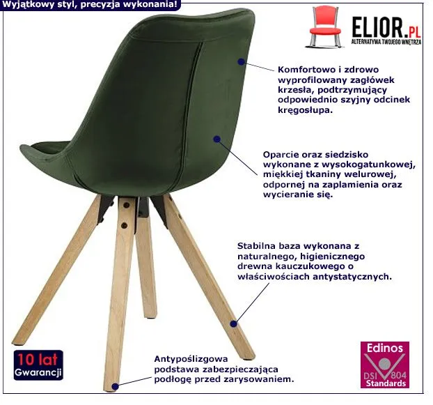 Retro krzesło Goldin jest meblem cechującym się starannością i niezwykłą dokładnością wykonania. To zasługa między innymi profesjonalnie dobranych i niezwykle trwałych materiałów meblarskich. Dzięki nim Goldin użytkuje się naprawdę wygodnie, przyjemnie i co istotne – bez uszkodzeń przez wiele lat. Do produkcji wyrafinowanie zaprojektowanego krzesła wykorzystano nowoczesne surowce wysokiej klasy. Siedzisko oraz oparcie fotela wysokogatunkowa i miękka tkanina welurowa, odporna na zaplamienia i wycieranie się. Siedzisko osadzono na naturalnym, higienicznym drewnie kauczukowym posiadającym właściwości antystatyczne. Zostało ono poddane specjalistycznemu lakierowaniu, uwydatniającemu walory estetyczne tego przepięknego surowca. Drewno jest niezwykle wytrzymałym materiałem meblowym, zapewniającym stabilność oraz przepiękny design krzesła. To niezwykle istotne, by meble, w które inwestujemy cechowało wytrzymałe, staranne wykonanie. Na szczęście z oryginalnie zaprojektowanym krzesłem Goldin w nowoczesnym wydaniu nie trzeba się o to martwić! Zachwycające i pełen retro wdzięku krzesło Goldin wciąż cieszy oko niebywałym szykiem. Ten mebel posiada niezaprzeczalne zalety – trwałość, stabilność, dokładne wykonanie, funkcjonalizm i oczywiście jakże modną, innowacyjną prezencję. Chyba każdy przyzna, że warto mieć tak piękny i komfortowy model krzesła u siebie.