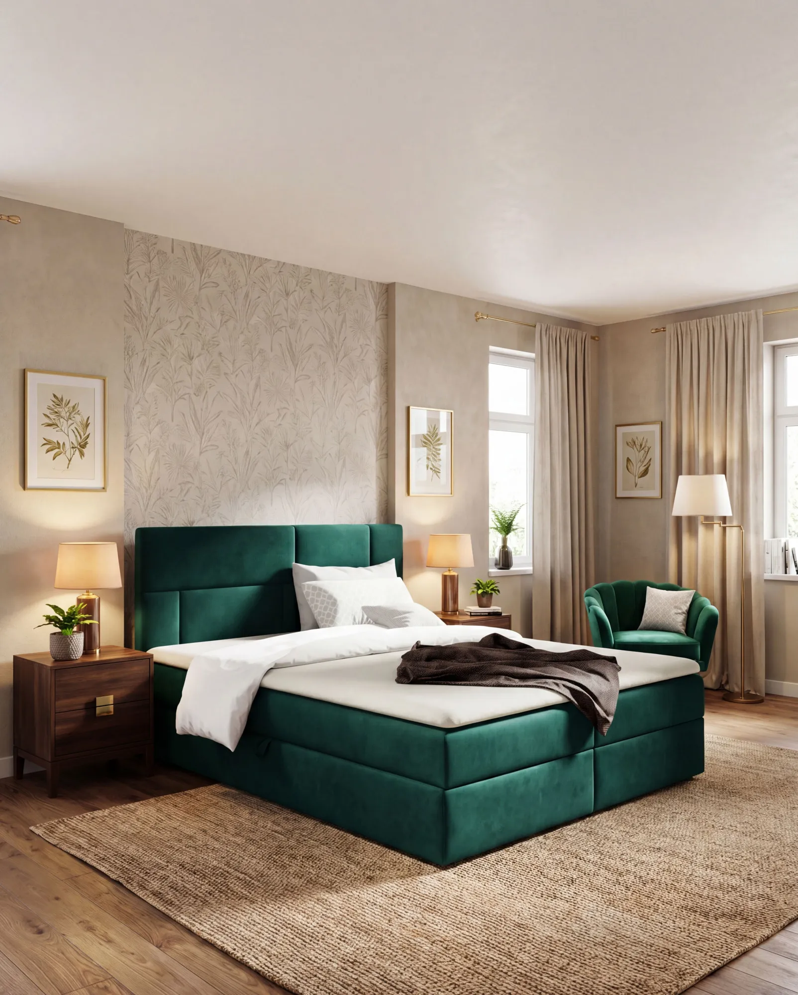 Aranżacja sypialni z zielonym łóżkiem kontynentalnym Orellis