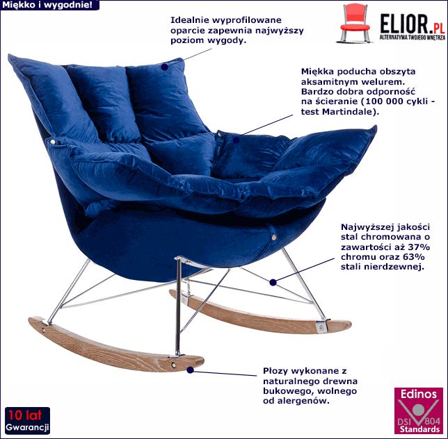 • Modna kolorystyka:  ciemnoniebieska tapicerka, stalowa podstawa i jasne bukowe płozy. Do wyboru są także inne kolory tego modelu: ciemnozielony i jasnoróżowy. Kliknij w link i zobacz też inne fotele bujane w sklepie Edinos.pl - na pewno znajdziesz coś dla siebie!
