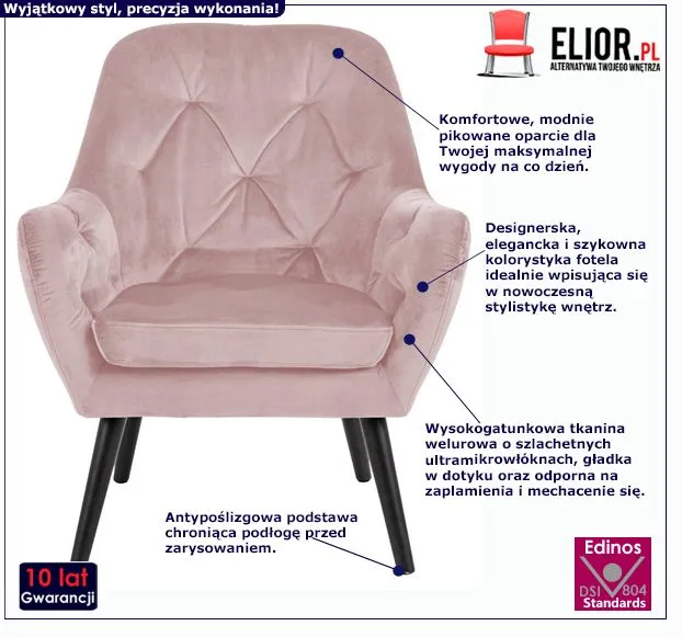 - Modna kolorystyka: różowy, czarny. Kliknij w link i sprawdź także inne fotele pikowane w sklepie Edinos.pl. Stwórz swój praktyczny zestaw mebli.