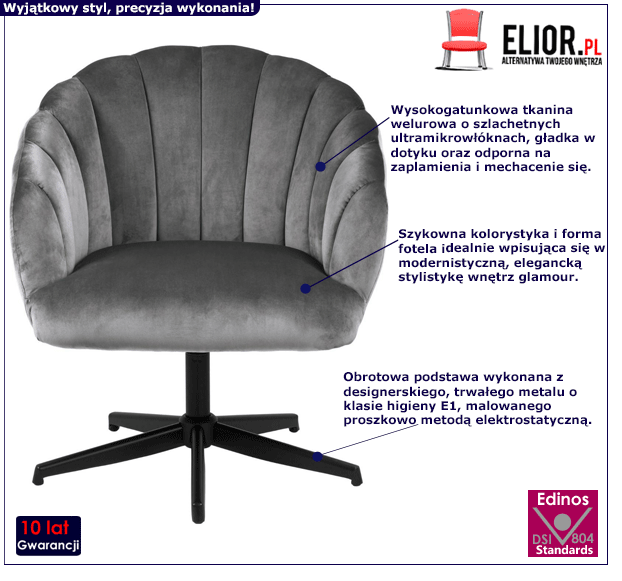 - Modna kolorystyka: szary, czarny. Kliknij w link i sprawdź także inne inne welurowe fotele w sklepie Edinos.pl. Stwórz swój praktyczny zestaw mebli.