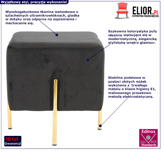 - Modny kolor: czarna, złota. Kliknij w link i sprawdź także inne piękne pufy w sklepie Edinos.pl. Stwórz swój praktyczny zestaw mebli.