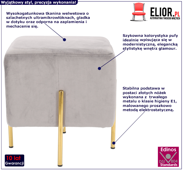 - Modny kolor: szara, złota. Kliknij w link i sprawdź także inne piękne pufy w sklepie Edinos.pl. Stwórz swój praktyczny zestaw mebli.