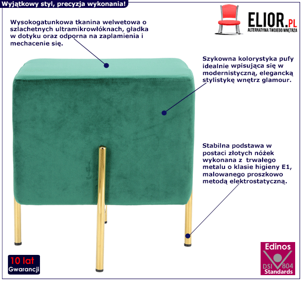 - Modny kolor: zielona, złota. Kliknij w link i sprawdź także inne piękne pufy w sklepie Edinos.pl. Stwórz swój praktyczny zestaw mebli.