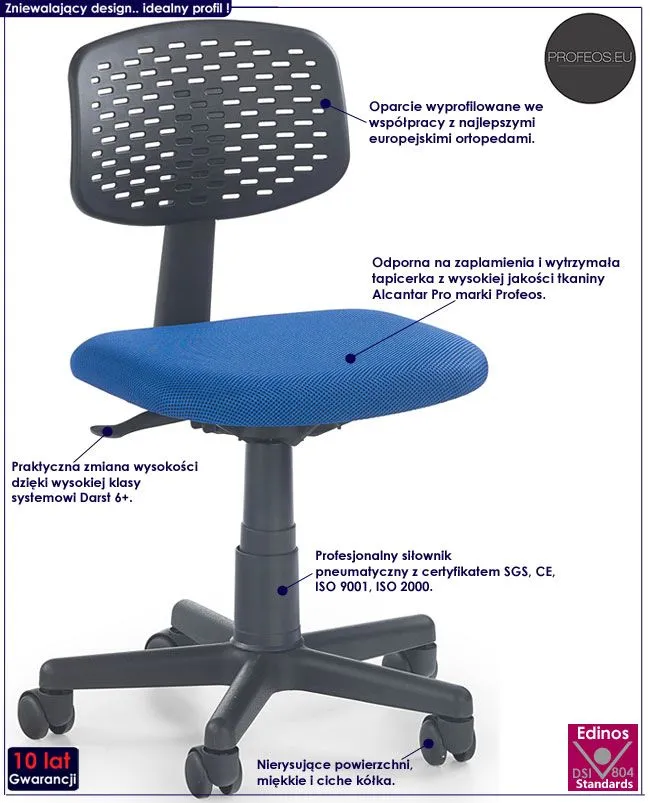 Czarujący fotel do biurka Cubot cieszy się powodzeniem zarówno wśród rodziców, jak i ich pociech. Mebel wykonany został z wysokiej jakości tworzywa polipropylenowego, co zapewnia wysoki komfort użytkowania. Materiał ten charakteryzuje się ponadprzeciętną wytrzymałością mechaniczną, jest również łatwy do utrzymania w czystości i można go przecierać na mokro (co jest szczególnie ważne w przypadku artykułów przeznaczonych dla najmłodszych). Designerska tapicerka mebla w kolorze niebieskim stworzona jest z wysokiej jakości tkaniny Alcantar Pro. Tkanina Alcantar Pro jako jedyna na rynku wyprodukowana jest z dokładnie wyselekcjonowanych ultramikrowłókien o objętości aż do 24-razy drobniejszej od ludzkiego włosa i charakteryzuje się wyjątkową żywotnością, odpornością oraz niezwykłą łatwością w utrzymaniu. Posiada ponadprzeciętne cechy wytrzymałościowe. Ergonomicznie profilowane we współpracy z europejskimi ortopedami siedzisko oraz wentylowane oparcie zapewniają dziecku wygodę siedzenia nawet podczas dłuższej komputerowej rozgrywki. Łatwą i precyzyjną zmianę wysokości siedziska gwarantuje unikalny system Darst 6+. Precyzyjny system Darst + sprawia także, że mebel rośnie wraz z dzieckiem. Zadbaj w zdrowie najbliższych dla Ciebie osób inwestując w wysokiej jakości fotel Cubot marki Profeos.