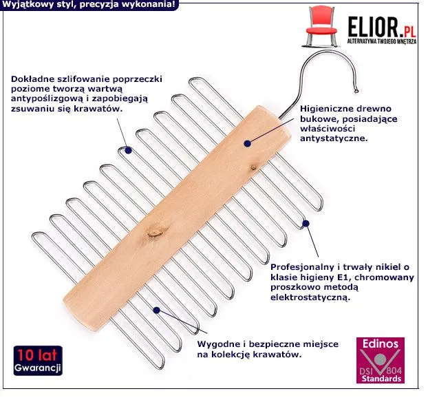 Należy również wspomnieć o jakże nowoczesnym, trwałym wykonaniu wieszaka Tigra. Swoją świetną prezencję i ponadprzeciętną wytrzymałość wieszak Tigra zawdzięcza profesjonalnym materiałom, z których został wykonany. Jest to wysokogatunkowe, naturalne drewno bukowe, posiadające właściwości antystatyczne. Dzięki tym właściwościom kurz nie osiada łatwo na wieszaku, a co za tym idzie – na naszych ubraniach. To bardzo ważne, by przechowywać garderobę w higienicznych, bezpiecznych warunkach. Na szczęście świetny wieszak Tigra to zapewnia dzięki ekologicznemu drewnu bukowemu. Zostało ono poddane profesjonalnemu lakierowaniu, co znacznie zwiększa trwałość wieszaka oraz jego odporność na zarysowania. Lakierowanie to również zabieg mający na celu wygładzenie powierzchni wieszaka. Gładka powierzchnia sprawa, że nasze krawaty „nie zaciągają się” i nie niszczą. Centralna część przeznaczona na umieszczanie na niej krawatów to z kolei odporny na zarysowania, niezwykle trwały nikiel o klasie higieny E1, chromowany proszkowo metodą elektrostatyczną. Ten surowiec zapewnia wytrzymałość wieszaka i możliwość użytkowania go przez wiele lat.