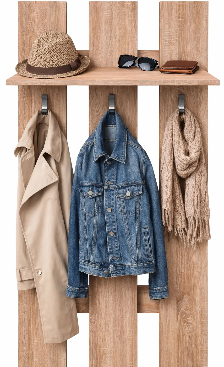 Na bieżące kurtki wieszak w sam nadaje się doskonale, zgodny z opisem, ilość haczyków jak dla mnie wystarczająca a górna półka znacząco zwiększa praktyczność tego mebla. Jestem zadowolona