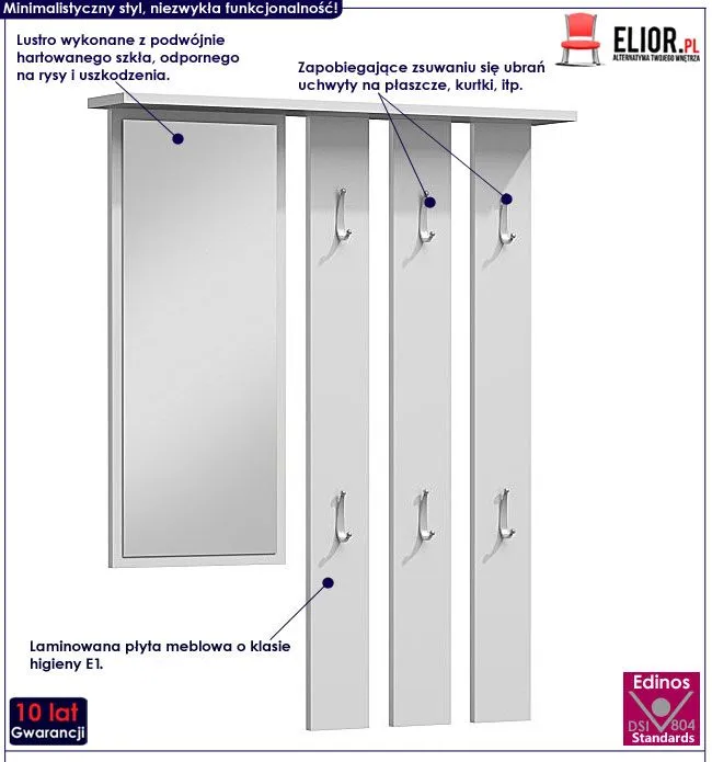 Praktyczny w użytkowaniu wieszak na ubrania Muvo wykonany został z laminowanej płyty meblowej o klasie higieny E1, uszlachetnionej cienkimi filmami melaminowymi. Posiada także specjalne włókna ułożone różnokierunkowo o strukturze sinusoidalnej, co zapewnia nadanie jej cech jakościowych oraz wytrzymałościowych. Dla zwiększenia trwałości mebla, obrzeża wieszaka wykończono odpornym na uszkodzenia mechaniczne oraz chemiczne tworzywem PCV. Praktyczne lustro wyprodukowano z podwójnie hartowanego szkła, dzięki czemu jest ono całkowicie odporne na rysy i uszkodzenia. Komfortowe lustro nie tylko pozwala Ci skontrolować swój wygląd przed wyjściem, lecz także optycznie powiększa nawet wąskie i ciasne pomieszczenie. Dzięki praktycznej półce zyskujesz również miejsce na czapki, apaszki, parasol, czy inne niezbędne przed wyjściem z domu dodatki. Wieszak oraz lustro możesz przymocować na dowolnej wysokości, dopasowanej do Twoich potrzeb. Stonowana kolorystyka i prosta forma sprawiają, że zestaw Muvo doskonale sprawdza się we wnętrzach urządzonych w stylu skandynawskim, jak też minimalistycznym czy nowoczesnym. Stwórz w swoim domu niepowtarzalny klimat z wieszakiem marki Elior!