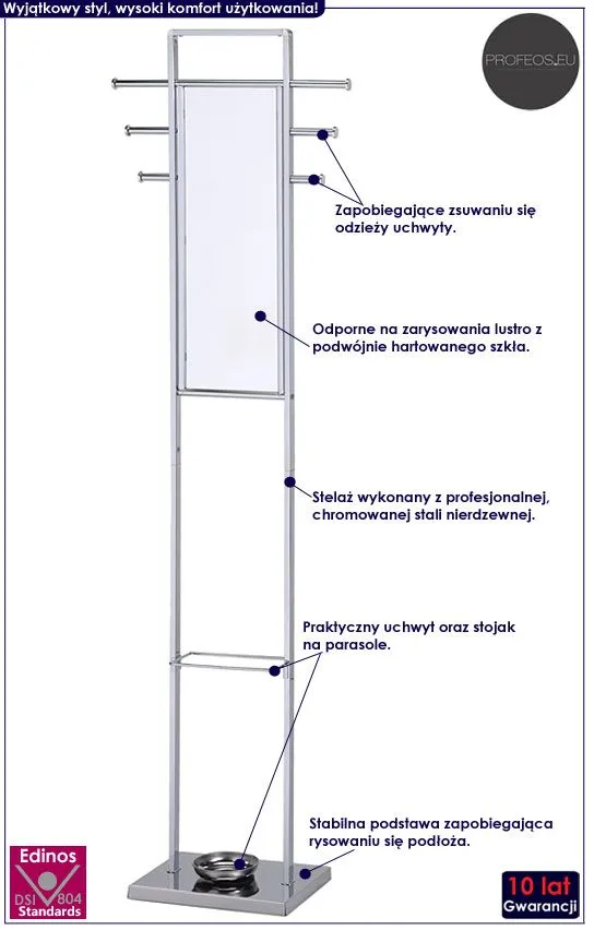 Praktyczny w użytkowaniu wieszak Sanati wyróżnia się nie tylko swoją unikalną formą, ale także zastosowaniem materiałów najlepszej jakości. Profil mebla stworzony jest z najwyższej jakości chromowanej stali o zawartości aż stali nierdzewnej oraz chromu, co gwarantuje mu niezwykły efekt wizualny, posiadając przy tym ponadprzeciętne cechy antykorozyjne oraz lepszą odporność na uszkodzenia mechaniczne . Wieszak posiada zapobiegające zsuwaniu się ubrań uchwyty, rozmieszczone na trzech różnych wysokościach (najniższe z nich pozwalają na zawieszenie odzieży młodszym domownikom). Praktyczne i komfortowe lustro wyprodukowano z podwójnie hartowanego szkła, dzięki czemu jest ono całkowicie odporne na rysy i uszkodzenia. Funkcjonalnym dodatkiem jest także uchwyt oraz stojak na parasole. Wnieś do swojego wnętrza nowoczesny i modny klimat z wieszakiem stojącym Sanati!