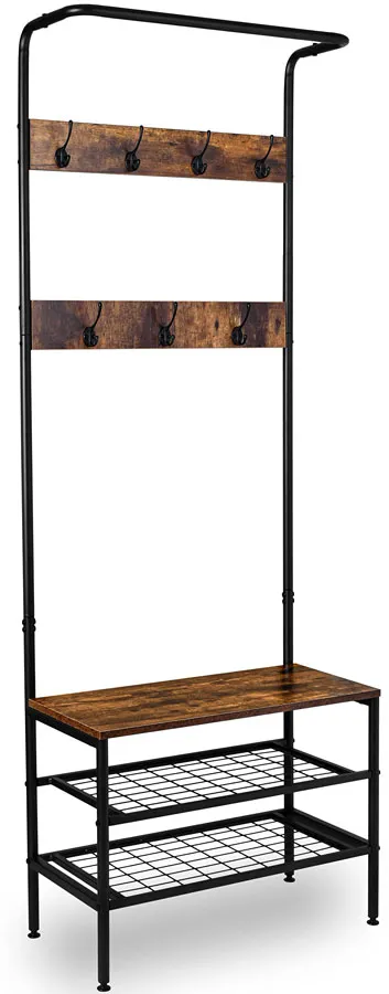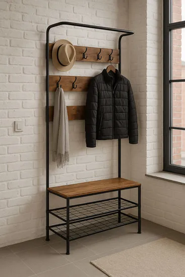 Dwie drewniane poprzeczki z metalowymi hakami – pomieszczą kapelusze, parasole lub torebki.