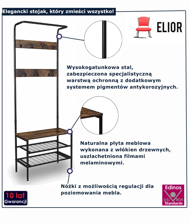 - Produkt posiada certyfikat jakości "Edinos Standards DSI 804", który potwierdza najwyższą jakość wykonania mebla oraz pełny stopień zgodności poszczególnych jednostek wytworzonego wyrobu z przyjętym wzorcem.