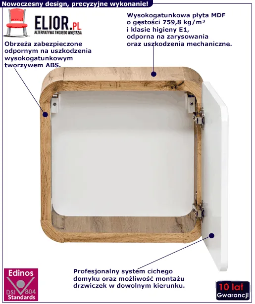 • Produkt posiada certyfikat jakości "Edinos Standards DSI 804", który potwierdza najwyższą jakość wykonania mebla oraz pełny stopień zgodności poszczególnych jednostek wytworzonego wyrobu z przyjętym wzorcem.