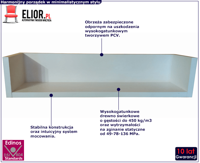 Poza wyjątkowym designem półka Timex dla zwiększenia trwałości stworzona została z naturalnego drewna świerkowego, dzięki któremu wyróżnia się ponadprzeciętną jakością. Drewno świerkowe z którego została wykonana półka Timex bezpośrednio po sośnie zajmuje drugie miejsce pod względem wartości użytkowej drewna. Wyróżnia się niezwykłą trwałością oraz łatwością w obróbce. Jest lekkie i miękkie oraz posiada liczne, regularnie rozmieszczone sęki. Jego barwa jest biała, czasem z lekko żółtym odcieniem. Charakteryzuje się także wysoką gęstością do 450 kg/m3 i wytrzymałością na zginanie statyczne od 49-78-136 MPa. Dzięki precyzyjnej pracy najlepszych specjalistów Timex wyróżnia się także doskonałym wykończeniem! Timex to bez wątpienia idealne podkreślenie każdego dobrze zorganizowanego wnętrza. Jesteśmy pewni, że spełni Twoje absolutnie wszystkie oczekiwania!