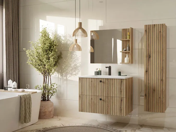 Kolekcja mebli łazienkowych Modi marki Edinos Premium powstała z myślą o osobach, które cenią nowoczesny design, dopracowane detale i praktyczne rozwiązania do codziennego użytku. Charakterystyczne ryflowane fronty w ciepłym odcieniu drewna tworzą eleganczny efekt wizualny, który idealnie wpisuje się w aktualne trendy wnętrzarskie. W skład kolekcji wchodzi smukły słupek łazienkowy oraz szafki pod umywalkę o szerokości 80 cm i 60 cm – dostępne zarówno w wersji z umywalką, jak i bez niej. Każdy z mebli został zaprojektowany tak, by zapewniać maksymalną funkcjonalność nawet w niewielkich łazienkach, jednocześnie zachowując spójną, estetyczną linię. Kolekcja Modi to idealna propozycja dla tych, którzy szukają harmonii pomiędzy wygodą a pięknem codziennego otoczenia.