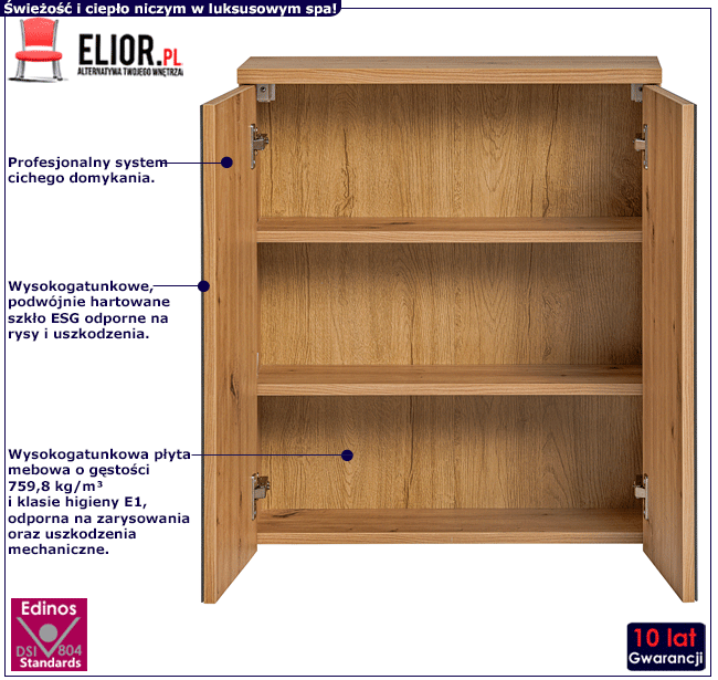 • Produkt posiada certyfikat jakości "Edinos Standards DSI 804", który potwierdza najwyższą jakość wykonania mebla oraz pełny stopień zgodności poszczególnych jednostek wytworzonego wyrobu z przyjętym wzorcem.