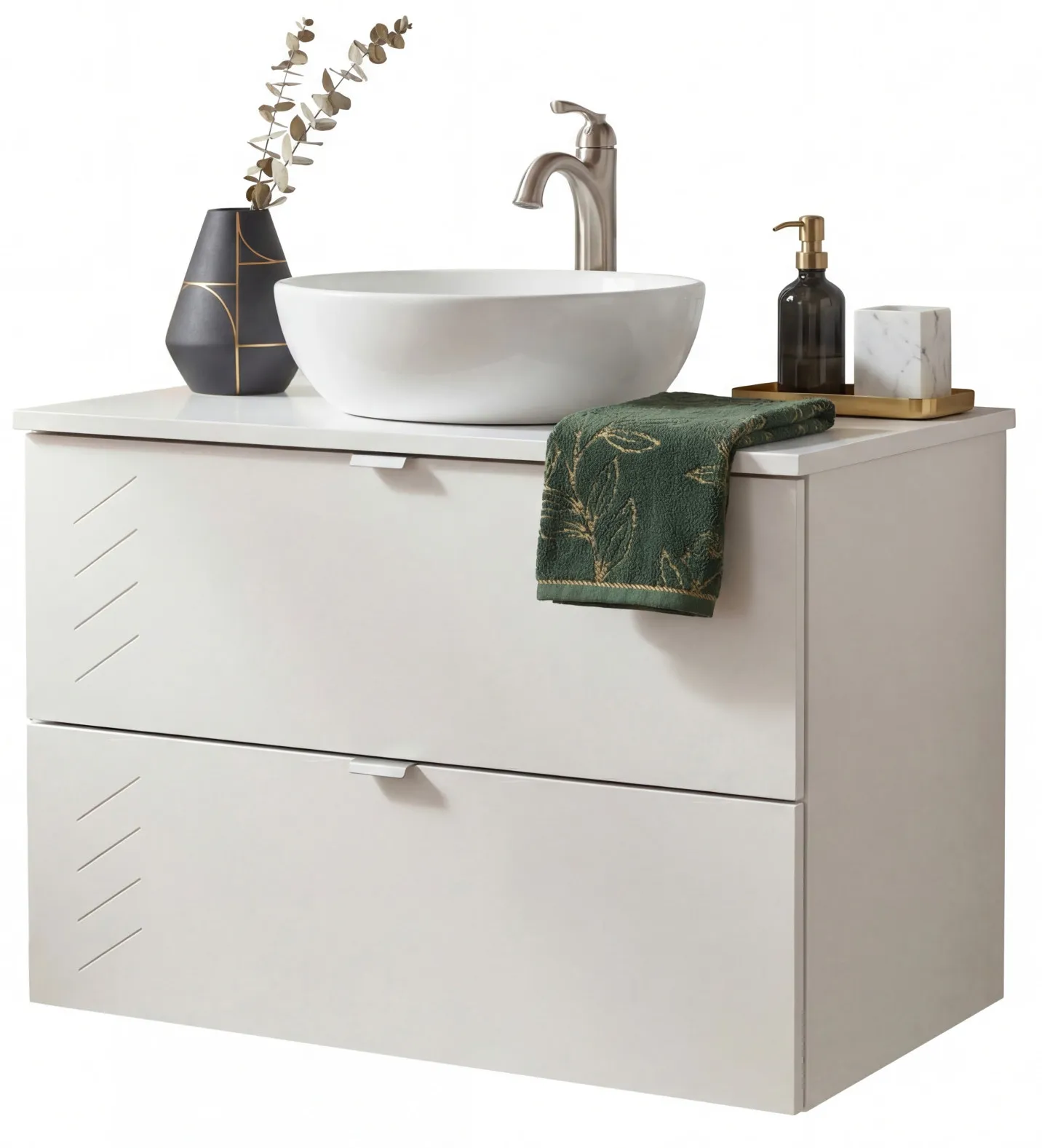 Przykładowa aranżacja z wykorzystaniem białej szafki łazienkowej Tiris 10X